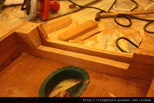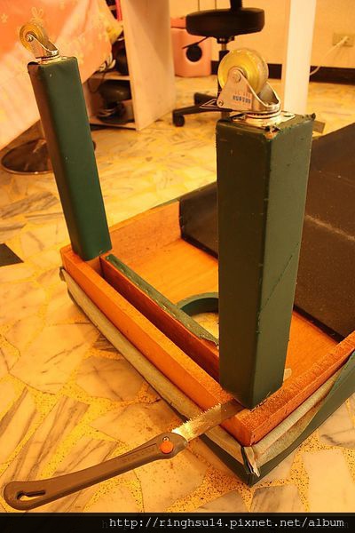 鋸掉原本的椅腳,這款床用柳安板材製成釘子超多鋸掉會比較快。