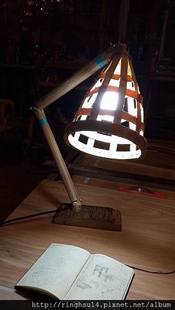 燈罩用木薄片編織,也只有自己做的燈具才會這麼豪邁有性格。木頭耐熱度夠,不過薄片受熱容易變形還是得好好固定。