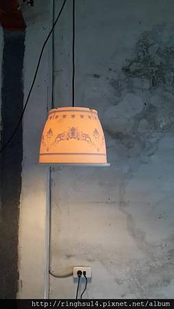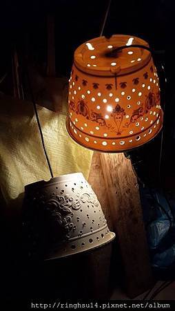 其他像是酒瓶燈罩,飼料桶燈罩什麼都可以拿來使用,只要別讓它燒著融化漏電就行了。